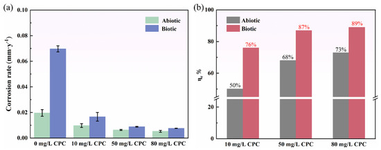 The corrosion rate of pure copper during a 14-day immersion in simulated oilfield-produced water is presented in Figure 3a. The results reveal that the corrosion rate in the biotic group (with SRB) was significantly higher than that in the abiotic group at the same CPC concentrations, demonstrating the pronounced role of SRB in accelerating the corrosion of pure copper. This finding is consistent with prior studies showing that SRB can enhance corrosion through mechanisms such as sulfide production and biofilm formation, which destabilize the protective oxide layer on metal surfaces. Interestingly, the corrosion rates in both the abiotic and biotic groups decreased consistently with the increase in CPC concentrations, demonstrating the effective inhibitory role of CPC. For instance, at 10 mg/L CPC, the corrosion rate in the biotic group decreased from 0.069 to 0.0167 mm/y, marking a nearly fourfold reduction. To quantitatively assess the inhibitory effect of CPC, the corrosion inhibition efficiency (ƞe) was calculated by using the following equation [34]: