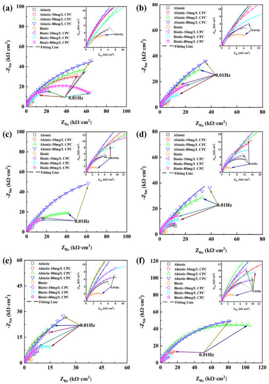 Nyquist plots for pure copper in the absence and presence of SRB after 14-day incubation with different contents of CPC. (a) After 1 day; (b) 3 days; (c) 5 days; (d) 7 days; (e) 10 days; and (f) 14 days.
