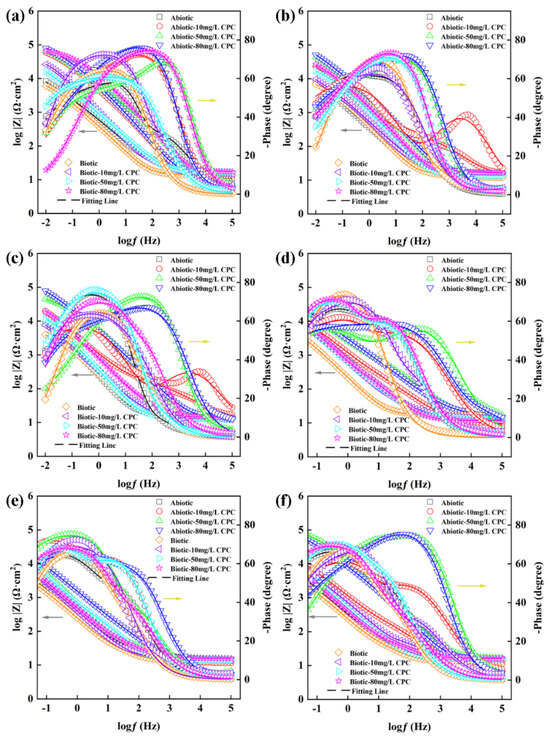 Bode plots for pure copper in the absence and presence of SRB after 14-day incubation with different contents of CPC. (a) After 1 day; (b) 3 days; (c) 5 days; (d) 7 days; (e) 10 days; and (f) 14 days.