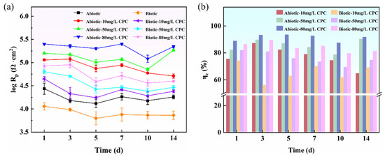where ZF, ω, and YF represent Faraday resistance, frequency, and admittance, respectively. Actually, Rp is the sum of Rct and Rf (Rp = Rct + Rf), and Figure 6a displays the variation in Rp values with time for different contents of CPC. In the presence of SRB, it was observed that the Rp value significantly increased when CPC was added to the simulated oilfield-produced water, and the Rp value increased with the increase in CPC content, indicating that CPC could reduce the MIC of pure copper in simulated oilfield-produced water. And as its content increased, the inhibitory effect became more significant. Moreover, the change in Rp value under the abiotic condition also showed the same trend, revealing that CPC also had corrosion inhibition performance in the abiotic environment. It was reported that the value of 1/Rp was directly proportional to the corrosion rate; therefore, the decrease in the 1/Rp value after the introduction of CPC can be applied to represent the corrosion inhibition efficiency, as indicated in Figure 6b. Obviously, on the first day, the corrosion inhibition efficiency reached over 75% at 10 mg/L CPC in the absence of SRB. In addition, the corrosion inhibition efficiency at 80 mg/L CPC remained above 90% during the 14-day corrosion period, indicating that with the increase in CPC content, its corrosion inhibition efficiency was higher. Although the corrosion inhibition efficiency trend of CPC under biotic conditions was consistent with that under the abiotic condition, the overall corrosion inhibition efficiency was slightly lower than that of the abiotic group, which was different from the corrosion inhibition efficiency based on weight loss data. It is noteworthy that the weight loss data indicate the cumulative metal loss during the whole 14-day inoculation period, while Rp data are the electrochemical results measured instantaneously and also affected by physiological changes in SRB [19], so the difference was expected. In summary, CPC possessed a corrosion inhibition effect on pure copper in simulated oilfield-produced water, and the corrosion inhibition efficiency improved with the increase in CPC content.