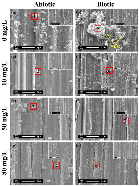 The SEM morphologies at 5000× and 1000× of the surface films and corrosion products after the 14-day inoculation period in the (a,c,e,g) absence and (b,d,f,h) presence of SRB with different concentrations of CPC: (a,b) 0 mg/L, (c,d) 10 mg/L, (e,f) 50 mg/L, and (g,h) 80 mg/L.