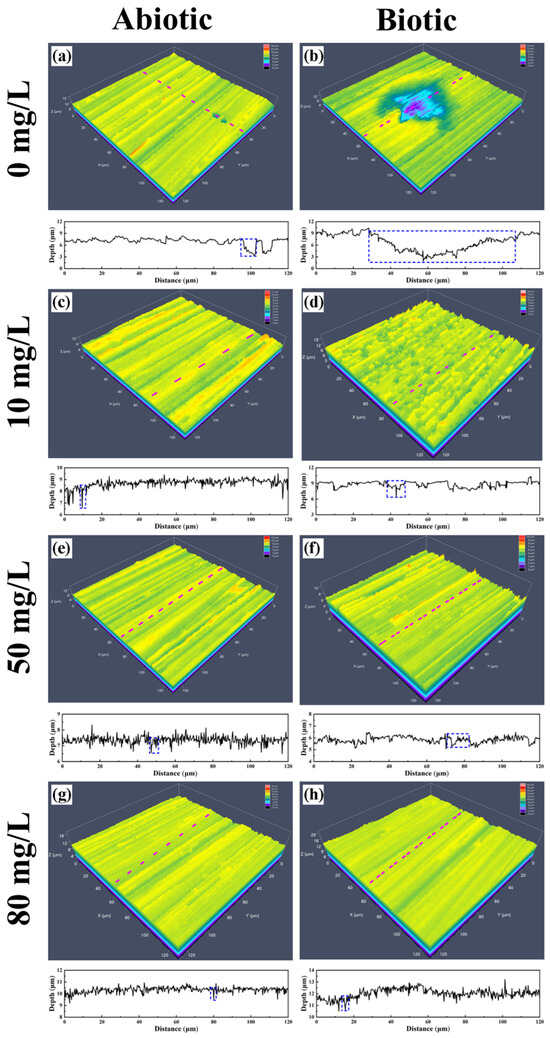 Figure 9 presents the cross-sectional images of the surface films on the coupons under different conditions. The results revealed that in the biotic group without CPC, the corrosion product films were significantly thicker compared with the abiotic group, indicating deeper corrosion penetration into the substrate due to MIC. However, with the addition of CPC, the thickness of the corrosion product films was markedly reduced. At the CPC concentrations of 50 mg/L and 80 mg/L, the corrosion product films were almost absent, demonstrating the strong inhibitory effect of CPC on the formation and accumulation of corrosion products. These results highlight the dual role of CPC in combating MIC: (1) inhibiting the activity of SRB, thereby reducing the biogenic sulfide production that accelerates corrosion, and (2) limiting the accumulation of corrosion products on the copper surface.