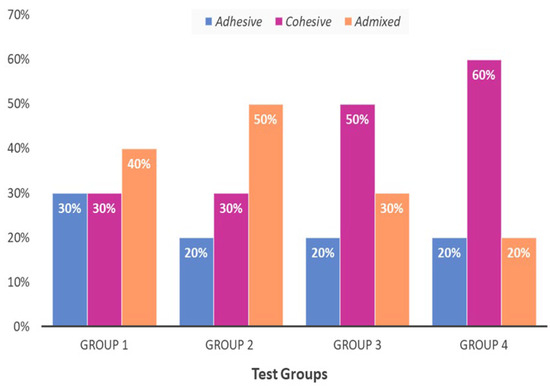 The failure mode analysis in Figure 1 presents the failure modes of the different investigated groups. Groups 3 and 4 predominantly presented cohesive fractures. However, admixed failures were mostly observed in Groups 1 and 2.