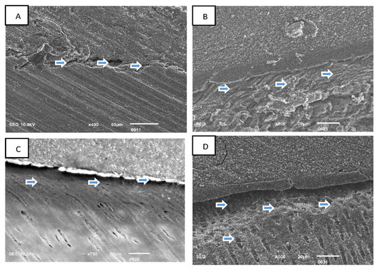 Nevertheless, Alkasite’s bond strength and ML, which are comparable to those of Ormocer, align with the findings reported by Awad et al. [25]. This is mainly attributed to the bulk-fill characteristics resulting from compositional modifications. The powder component consists of various glass fillers, initiators, and pigments, while the liquid component contains di-methacrylates and initiators. Additionally, the incorporation of an isofiller enhances adhesion strength and reduces leakage [25,26]. The results of both groups can be further corroborated through SEM interface analysis, as they exhibited longer resin tags than the other tested groups