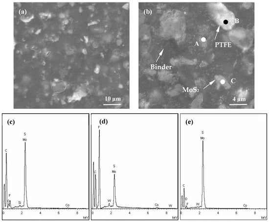 SEM micrographs (a,b) and element analyses of points A–C (c–e) of (b) of MoS2/PTFE coatings.