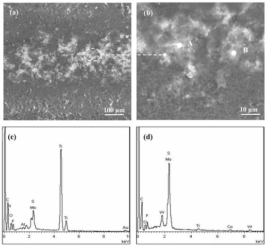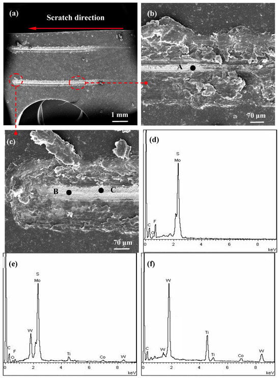 In contrast, Figure 9 shows the SEM micrographs and EDS analyses of the coated carbide. The results highlight a clear difference in the wear property between the two samples. The MoS2/PTFE-coated sample indicated a much better surface, devoid of plowing marks and material adhesions that existed on the uncoated carbide. The smoothness of the worn surface suggests that the MoS2/PTFE coatings acted as an effective lubricant during the friction test, preventing the direct metal-to-metal contact between the carbide and the counterpart ball [,]. It was also observed that the wear area width was about 55 μm for the coated carbide, compared to only 45 μm for the uncoated carbide at the load of 80 N, which was increased by approximately 22%. The increase in wear scar width can be attributed primarily to the lower shear strength and surface hardness of the coatings. Despite this, the MoS2/PTFE coatings, due to their greater thickness, maintained continuous and stable lubrication throughout the friction process, and the substrate experienced virtually no wear under the same testing conditions.