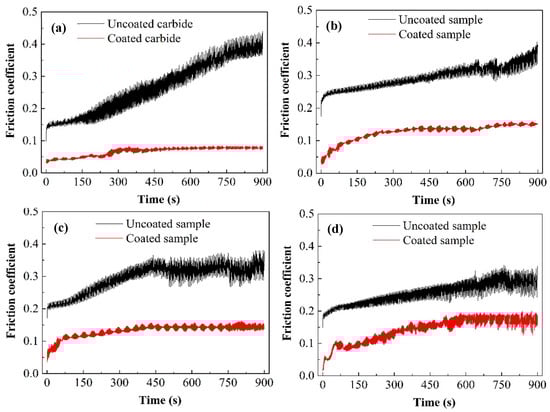 Figure 6 presents the friction coefficient curves of carbide under different loads. As indicated in this figure, it is evident that the coated carbide demonstrates a clear decrease in friction coefficient compared to the uncoated one.