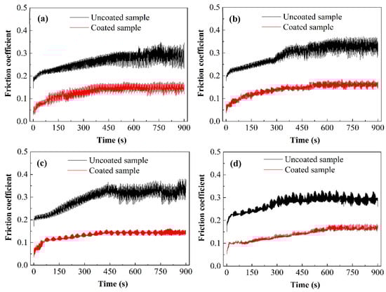 Friction coefficient curves under different speeds (load = 60 N, sliding time = 15 min): (a) 4 mm/s; (b) 6 mm/s; (c) 8 mm/s; (d) 10 mm/s.