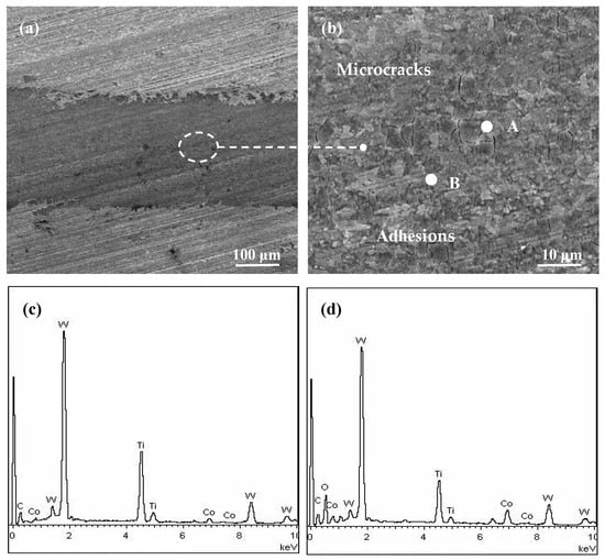 To further investigate the composition of the adhesions, an EDS analysis was conducted in Figure 8c,d. The results revealed that the adhesion material primarily consisted of WC and Co elements. This indicates that the interface between the two surfaces became damaged, leading to the transfer of material from one surface to another.