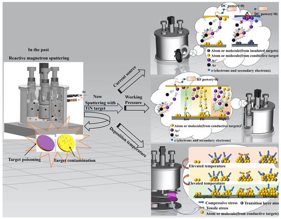 In this work, we used TiN targets with a precise stoichiometric ratio (the atomic percent ratio of Ti/N to be observed, approximately 1) to deposit protective coatings. Our study is divided into three mutually progressive steps, as illustrated in Figure 1. Three independent variables were systematically controlled to investigate the influence mechanism of process parameters on thin film deposition. (i) Sputtering mode: Under identical process conditions, the properties of TiN coatings deposited by DC magnetron sputtering and RF magnetron sputtering were comparatively analysed. (ii) Ar gas pressure: For RF sputtering deposition, the effects of Ar gas pressure (1.5 Pa vs. 0.5 Pa) were examined. (iii) Temperature dependence: The effect of deposition temperature on the properties of TiN films was investigated using an RF magnetron sputtering system at 0.5 Pa Ar gas pressure.