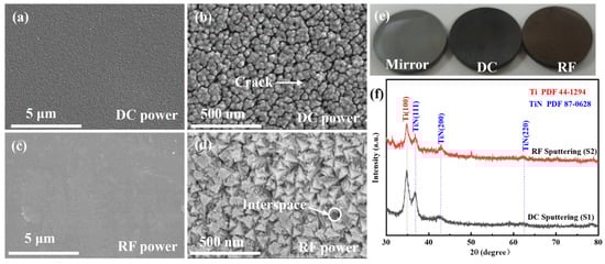 Morphology and XRD patterns of TiN coatings deposited under DC and RF power sources. (a,b) show the surface morphology of DC-sputtered TiN coatings at low and high magnifications, respectively, (c,d) present the surface morphology of RF-sputtered TiN coatings at low and high magnifications, respectively, (e) compares the macroscopic surface morphology of the bare substrate and TiN coatings deposited under DC and RF sputtering modes, (f) displays the XRD patterns of TiN coatings synthesized under different sputtering modes.