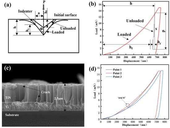 (a) Schematic diagram of the nanoindentation process, (b) nanoindentation loading and unloading displacement curves, (c) cross-section of the DC-prepared TiN layer, (d) 3-point nanoindentation curve of the DC-sputtered TiN coating.