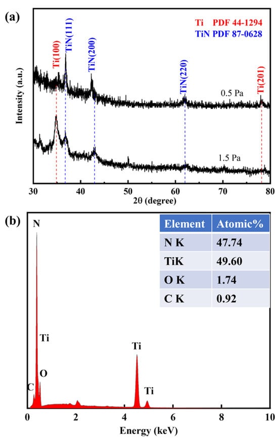 (a) XRD patterns of TiN coatings prepared under different Ar pressure conditions; (b) chemical composition of little bit of TiN coating surface deposited at 0.5 Pa.