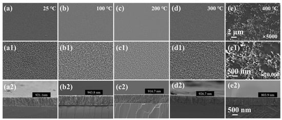 Microscopic morphology of TiN coatings prepared at substrate temperatures of 25, 100, 200, 300 and 400 °C, with (a–e) magnifications of 5000×, (a1–e1) magnifications of 20,000× and (a2–e2) cross-section morphologies of the coatings.