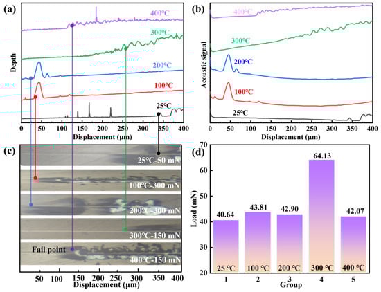 Nano-scratch profiles of TiN coatings prepared at different temperature conditions, (a) scratch depth versus distance profile, (b) acoustic signal versus distance profile, (c) optical micro-morphology of scratches, (d) load corresponding to the coating failure point.