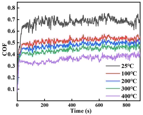 In general, a lower COF of the tool coating reduces the heat generated during the cutting process and improves machining efficiency, while contributing to the quality of workpiece processing. Figure 8 shows the calculated COF versus time curve for friction generated by the mutual motion between the friction partner of the pin-on-disc friction wear analyser and the TiN coating. There is a good linear relationship between the deposition temperature of TiN coatings and the COF, which maintains a decreasing trend as the temperature of the TiN layer increases. During the friction wear test, the COF has been kept in a small fluctuation range, which indicates that the TiN film has not yet reached the stage of severe wear. The COF between the TiN coatings and the friction partner made of Al2O3 is 0.67, 0.52, 0.48, 0.44 and 0.36 as the deposition temperature of the TiN coating increases, respectively. The coating deposited with a TiN target has a lower COF as compared to TiN coatings prepared by reactive magnetron sputtering [].