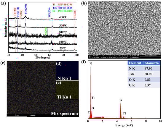 (a) XRD patterns of TiN coatings deposited at different temperature conditions, (b) analysing regions of elemental composition, (c–f) characteristic elements X-ray mapping and EDX spectra of TiN samples prepared at 400 °C.