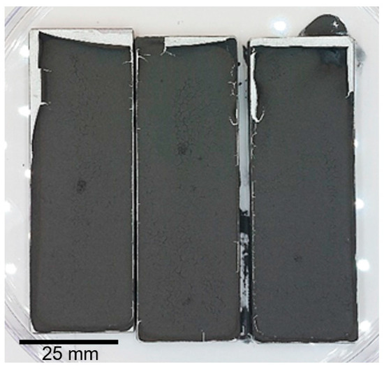 Stable, aqueous cermet suspensions with 50 wt.% solid loading were then developed from a solution of 1.6 wt.% sodium alginate and distilled water, with 0.1 vol.% Darvan® C-N (Vanderbilt Minerals LLC, Norwalk, CT, USA) added as a dispersant. The suspension pH was then adjusted to a value of 8.5 using a solution of NaOH; it has previously been shown that this pH/dispersant combination results in low-viscosity, high-solid-content TiC suspensions [30]. The cermet/alginate suspension was subsequently homogenised on a magnetic stir plate for an average of 3 h at 385 rpm and then vacuum-degassed. An ‘in-house’ dip-coating apparatus, with a linear driven stage in the vertical direction, was designed and employed for preplacement of feed material on the substrate by a simple dip-coating approach. The part to be dip-coated is then lowered into the stabilised suspension. Precise control of withdrawal speeds at 0.05 mm/s (at an angle of 90° to the suspension surface) was obtained via a control board interfaced to an Arduino controller (Arduino AG, Ivrea, Italy). The D2 tool steel coupons were immersed and withdrawn from the coating suspension, with the long dimension of the coupon oriented parallel to the direction of withdrawal. After dip-coating, the substrates were dried at 20 ± 3 °C for 24 h prior to laser cladding. This process gave rise to adhered powder coatings that were roughly 200 to 250 µm in thickness. Figure 1 shows an example of a coated coupon prior to L-DED cladding. The chemical compositions of the coating feedstock mixtures and D2 steel substrate are provided in Table 2 and Table 3, respectively.