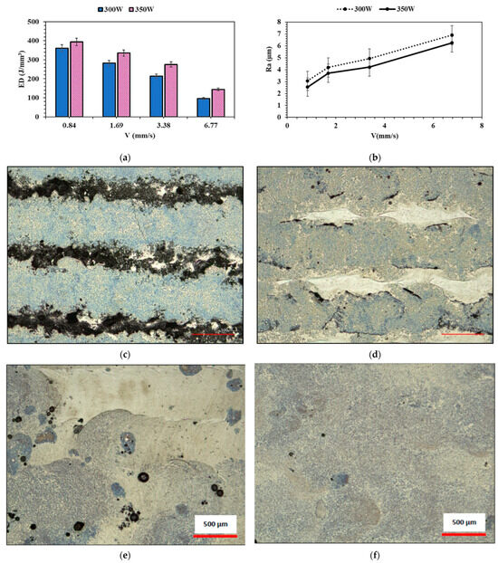 Examples of surface morphologies related to various ED values are shown in Figure 4c–f. Macro-characterisation of the as-processed samples, by means of CLSM measurements, revealed that successful clad layers were built within the narrow range of 300 to 350 W laser power and 0.84 to 6.77 mm/s laser scanning speed. As a consequence, only clads obtained at these two laser powers are discussed in further detail. The surface roughness of the fabricated clads was strongly dependent on the calculated ED, where visibly smother surfaces were observed at higher ED values (i.e., >150 J mm−3), reaching the lowest roughness (Ra = 3–3.5 μm). At lower calculated ED values, the resultant clads exhibit an irregular surface, with uneven scan lines and cavities between tracks, as shown in Figure 4c.