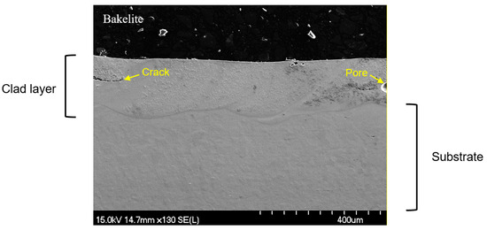 Typical SEM cross-sectional view of a ceramic–metal L-DED clad, highlighting the thickness and uniformity.