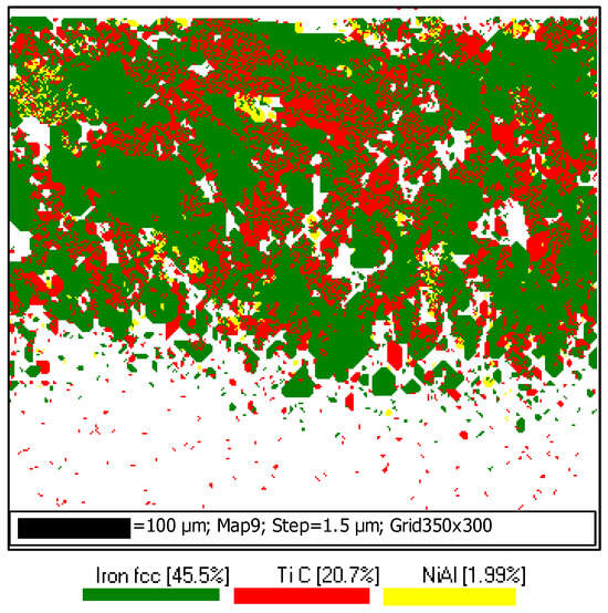 Microstructural evaluation of the clads fabricated at various laser scanning speeds revealed that any size refinement of the hard carbide phase is closely correlated with the laser scan speed. This is attributed to reduced irradiation time and the resultant energy absorbed into the melt pool. Therefore, an increased solidification rate results in the formation of a finer microstructure and minimal dendritic growth of TiC particles. Similar results have been observed by other research groups, suggesting that faster cooling rates due to higher extraction of energy by the substrate, and therefore formation of a finer microstructure, result from use of increased laser scanning speed [42,43,44]. The average distribution of the solidified phases and their chemical compositions within the TiC-based clad on D2 steel (P = 350 W and τ = 1.4 s), with respect to depth from surface, was verified through combined EBSD and EDS analysis; this information is provided in Figure 8 and Figure 9. As demonstrated in Figure 8, discrete chemical phases are contained through the depth of the clad layer, observed through a phase map obtained from EBSD analysis. The EBSD phase map features three colours, specifically green, red, and yellow, which were selected during the analysis and correspond to FCC iron, TiC, and NiAl, respectively. These observations are further confirmed by X-ray diffraction, shown in Figure 10, which compares the dip-coated surface prior to laser cladding (Figure 10a) with that obtained after cladding (Figure 10b). The XRD demonstrates the retention of TiC, dilution by the D2 steel substrate while molten, and retention of NiAl (rather than formation of Ni3Al). In this instance, reaction of the elemental Ni directly with the steel is likely.