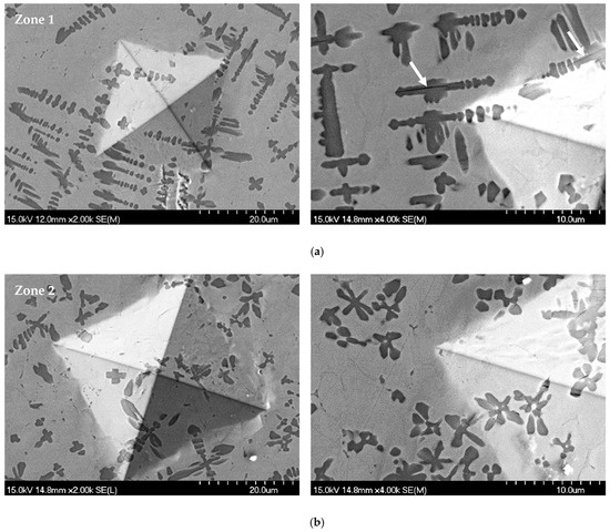Representative SEM micrographs obtained from indentations imprints on cross-sections of the clads are presented in Figure 13, in relation to its location on the surface of the clad, notably for the following: zone 1, which is the top portion, and zone 2, which is located at the mid-section of clad layer. The images also highlight the corners of the indentation at higher magnifications. According to the microscopy results, the indents exhibit clear boundaries with sharp edges and no extended damage outside of the indentation area. However, a few isolated microcracks, which appear to show a clear crystallographic directionality with the cubic carbide (white arrows), were observed at higher magnifications within the hard phase of the composite clads.