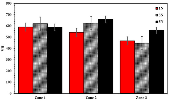Figure 12 presents examples of the Vickers indentations obtained within zone 1 (top of the of clad), zone 2 (mid-section of the clad), and zone 3 (near the substrate/clad interface), under an applied load of 5 N. Laser scans were used to generate an accurate profile of the indents, to help assess the type of deformation within the indent at various depths under the applied loads. The indented depth, at constant load, exhibited an increase when moving from the surface of the clad towards the substrate, highlighting reduced hardness due to the reduction in the volume of hard phase.