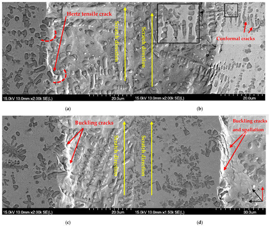 Figure 17 illustrates example micrographs related to scratch damage arising on the surfaces for a clad processed at P = 350 W and τ = 0.6 s, under constant applied loads of 10 N, 20 N, 30 N, and 40 N. The plastic deformation of traditional polycrystalline metals through the movement of lattice dislocations within individual grains is well known [46,47]. The progression of scratch damage on the clad D2 substrate, under an applied load of 10 N (Figure 17a), shows that slight plastic deformation of the surface was accompanied by the formation of Hertz-type tensile cracks at the edges of the scratch track. By increasing the applied normal force to 20 N (Figure 17b), the appearance of conformal cracks within the structure of the hard carbide phases was observed, in accordance with the initiation of buckling cracks at the edges of the scratch track. Under an applied load of 30 N, buckling cracks were again observed at the edges of the scratch track, which were combined with cohesive spallation of the clad at 40 N.