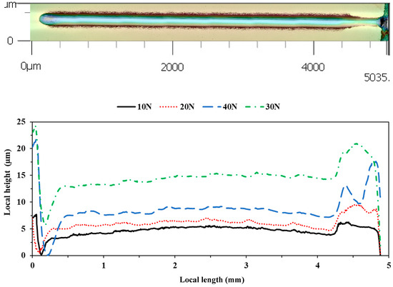 An example of cross-sectional scratch depth profile on the L-DED clad D2 tool steel under applied loads of 10 N, 20 N, 30 N, and 40 N. The overall image was generated by stitching sequential CLSM images. Note that the bulk material is shown on the left-hand side of the image, with the clad layer and free-surface on the right-hand side.