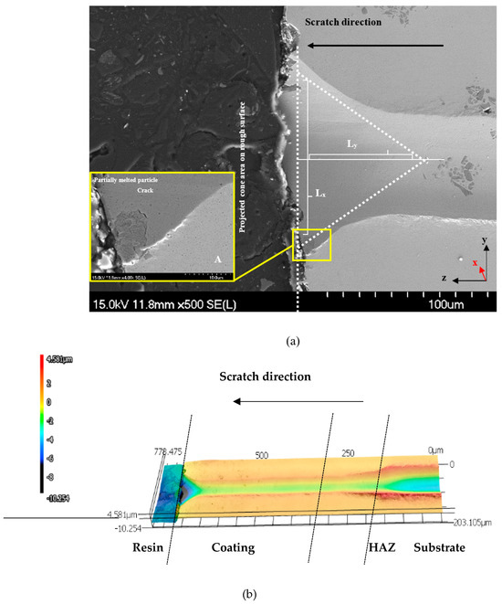 (a) SEM image of the tip of a through thickness scratch, for TiC-based cermet clad on D2 steel under 30 N applied normal force. (b) CLSM image of conical fracture arising within the scratch cross-section. The associated x-axis denotes the laser scanning direction during clad fabrication.