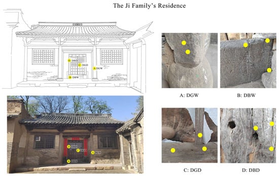 The Ji family residence’s facade displays the distribution of the sample collection. The four sampling points (A–D) are identified as the column base, door pier, door frame, and door window. In addition, (A–D) also corresponds to samples of four different situations, namely dwelling bad door (DBD), dwelling good door (DGD), dwelling bad wall (DBW), and dwelling good wall (DGW).