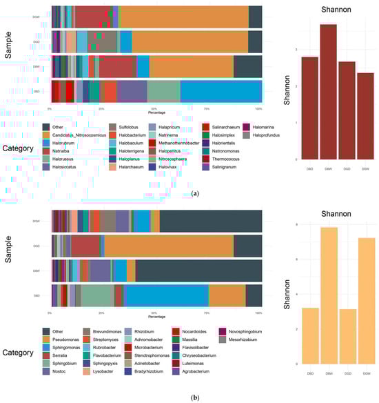 The taxonomic composition of bacteria, archaea, and fungi was obtained from metagenomic data and is categorized at the genus level. This information is visually shown in Figure 2. The Shannon Diversity Index was employed to assess the within-sample alpha diversity of each metagenome. This index provides insights into the community richness and evenness, hence highlighting variations observed across different sampling locations in this study. The Shannon diversity values were 3.22, 7.83, 3.14, and 7.22 for bacteria; 2.80, 3.68, 2.67, and 2.36 for archaea; and 1.76, 4.58, 3.48, and 5.11 for fungi from DBD, DBW, DGD, and DGW samples, respectively. As shown in the Shannon diversity values, overall, the biodiversity on the walls is higher than that of the wooden structures. In archaea, the diversity of damaged buildings is higher than that of intact buildings. Conversely, in fungi, the diversity of damaged buildings is lower than that of intact buildings. No significant differences were found between good and bad buildings in bacteria.
