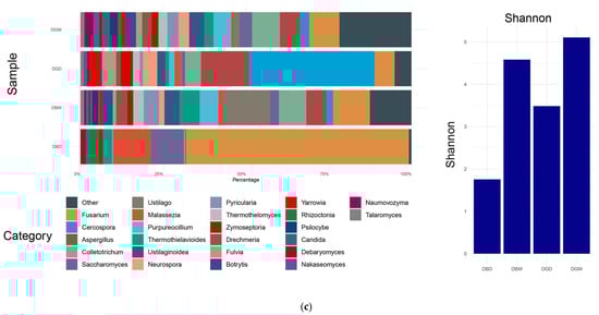 To investigate the impact of the environment on the Ji family’s residences, particularly near heavily damaged doors, we vigorously wiped the surfaces of both the good and decayed areas of the lapis lazuli gate piers and door frames with cotton swabs. As noted in previous studies, deadwood bacteria and fungi predominantly inhabit wooden structures while accompanying carbon and nitrogen cycles []. In contrast, stone surfaces are primarily associated with Pseudonocardia, Sphingomonas, and Streptomyces, along with a focus on nitrogen cycling []. The main microbial communities of archaea are illustrated in Figure 2a. The prevalence of the archaea genus in DGW and DGD is mostly attributed to Candidatus Nitrosocosmicus, which accounts for almost 50%. The presence of Candidatus Nitrosocosmicus in DBW remains but with a notable decrease in occupancy. Candidatus Nitrosocosmicus has limited presence within the DBD dataset; however, there is a notable rise in the prevalence of Halosiccatus and Halorussus. This observation implies that the occurrence of breakage may be attributed, at least in part, to these aforementioned genera. The observed decline in Candidatus Nitrosocosmicus was concomitant with an elevation in both Halosiccatus and Halorussus. The distribution of bacterial communities of genera is displayed in Figure 2b. A disparity in bacterial communities between DGW and DBW can primarily be attributed to the heightened proportion of alternative genera. It is indicated to be plausible that bacterial contamination could be a contributing factor to the corrosion of DBW (Figure 1, B). A comparison of bacterial communities between DGD and DBD revealed a significant decrease in Pseudomonas proportion in DBD. Additionally, the proportion of Serratia was also reduced, while the proportion of Sphingobium and Sphingomonas exhibited a significant increase. These findings suggest that the altered community of Sphingobium and Sphingomonas may be the primary factor contributing to the breakage of DBD. An additional examination of the fungal communities of genera in various samples reveals that in comparison to bacteria and archaea, the presence of fungi exhibits a more pronounced diversity across different samples in DGW and DGD. Notably, there is an augmented proportion of Ustilago specifically in DBW. A comparative analysis of the fungal community in samples from individuals with DGD and DBD demonstrates a noteworthy reduction in Cercospora proportion and a notable elevation in the proportion of dominant microbial communities of Fusarium, which is associated with the observed damage in DBD. Additionally, a slight increase in the abundance of Saccharomyces and Malassezia is also evident.