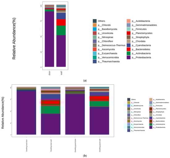 Metagenomic distribution from each sample. (a) Bar plot of phylum distribution between door and wall. (b) Bar plot of phylum distribution.