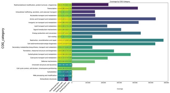 Enrichment of Cluster of Orthologous Groups of proteins (COGs) analysis in each sample, with heat map for log10 (coverage) from each sample and bar plot for total read coverage visualization.