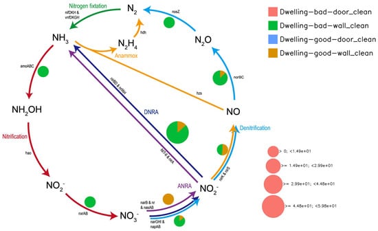 In addition, the investigation of the nitrogen cycle emphasized the importance of ammonia oxidation and nitrification processes in the development of corrosion, with archaea potentially having a greater impact than bacteria [,]. This study found that damaged areas experience frequent nitrogen-cycling mechanisms, particularly a high number of dissimilatory nitrate reductions to ammonium in DBW. In a dry and high-temperature environment, nitric acid oxidation may produce ammonium, leading to the corrosion of stone columns. This process can result in the buildup of ammonium, which can potentially cause the removal of NO3− and increase NH4+ in building materials, causing the biodeterioration of sandstone []. The heightened nitrogen-cycling activity observed in the affected locations indicates that the microbial populations responsible for nitrogen transformations have a crucial impact on the degradation of the residential homes belonging to the Ji family. Implementing focused treatments to control these microbial processes could aid in maintaining the structural stability of the buildings.