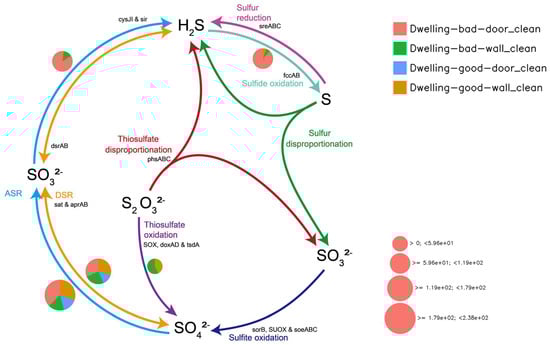 Specifically, doors found in residences have been linked to the process of thiosulfate oxidation, where S2O32− is converted to SO42− (Figure 7). Microbial communities have a crucial role in facilitating the process of thiosulfate oxidation, which is a significant alteration of sulfur []. Specific microbial communities facilitate the oxidation of thiosulfate to sulfate, hence playing a role in the total sulfur cycling in the environment. The existence of these sulfur conversion mechanisms signifies the active interplay between bacteria and sulfur compounds, which ultimately impacts the deterioration of structures.