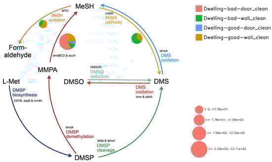 Dimethyl sulfoniopropionate (DMSP) is primarily found in marine ecosystems and is a type of metabolite produced by marine microorganisms []. While DMSP itself is not typically directly engaged in the corrosion process of building materials, its oxidation product, dimethyl sulfide (DMS), may be associated with building corrosion, particularly when there is metal present in the building’s structure. From the genome sequencing, we can obtain the conclusion that the DBD showed a relationship with the transfer from MMPA to MeSH. From the results, we can conclude that DBD exhibits a significant association with the transfer from MMPA to methyl mercaptan (MeSH) (Figure 8). The changes in the makeup of the microbial community emphasize the necessity of carrying out targeted microbial management in order to combat the degradation of architectural heritage that is caused by organic sulfur []. Particularly vulnerable are the regions surrounding metal components, such as nails and fasteners on wooden doors and windows. These areas may be particularly sensitive to damage. Following the completion of the genome sequencing, we are able to draw the conclusion that DBD has a substantial correlation with the transfer of methyl mercaptan (MeSH) from methyl mercaptan (MMPA) (Figure 8). It is possible that the presence of metals in the building, such as nails or fittings, could make these microbiological activities easier to carry out, which would result in a more rapid deterioration of the structure. Dimethyl sulfide (DMS) undergoes oxidation in the environment, resulting in the production of sulfuric acid []. Sulfuric acid is a potent acid that has the potential to cause corrosion on metal surfaces. The DMSP cycle indirectly contributes to the process of building corrosion by means of its oxidation product DMS. Furthermore, the byproducts of DMSP degradation may also include sulfide, which is a prevalent contributor to the corrosion of buildings. In a moist environment, sulfide reacts with the metal surface, resulting in the formation of sulfide precipitation. By adding protective measures into current conservation techniques, it is feasible to reduce the influence of microbial populations on the architectural history of the Ji family’s residential homes. The need for focused microbial control becomes apparent, and the utilization of metagenomic analysis is essential for the development and improvement of these techniques. This technique not only improves the protection of historical buildings but also offers vital knowledge for the preservation of other cultural heritage sites that encounter comparable difficulties.