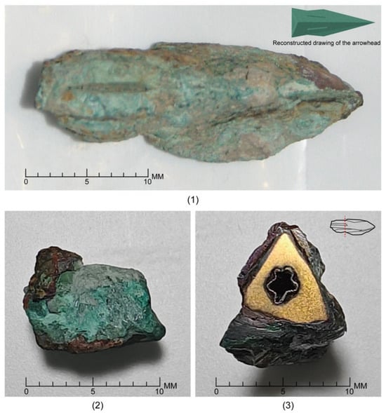 24]. However, the characteristics of different bronze arrowheads vary depending on their location. Existing research has not yet fully targeted the Minyue region. Furthermore, due to their prolonged underground burial, bronze arrowheads often face rust-related issues. By studying their rust mechanism and preservation status, we can explore effective cultural relic protection technologies and methods and provide a scientific basis for the protection of bronze arrowheads and other bronze artifacts.