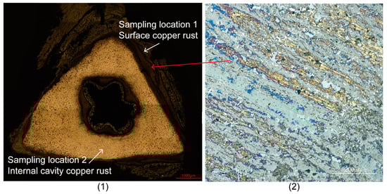 Figure 7(1), (2) (50× and 100× magnification), the corrosion layer at sampling location 2 shows a more obvious wavy texture. This texture may be due to the long-term erosion of the bronze surface by the external environment (such as the accumulation of water inside the bronze arrowhead), resulting in periodic deposition of corrosion products along the stress concentration area. This wavy deposition structure was not observed at sampling location 1, indicating that sampling location 2 may be in a more dynamic environment, and the corrosion to which it is subjected is more complex and multi-directional.