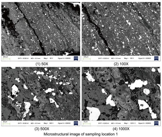 Figure 7(3), (4) (500× and 1000× magnification), the fracture structure at sampling location 2 is more penetrating, and the interconnectivity between fractures is significantly enhanced. These cracks not only extend along the corrosion layer, but they also tend to penetrate into the matrix, indicating deeper damage. This is different from the phenomenon of the cracks at sampling location 1 being mainly concentrated in the corrosion layer, indicating that long-term exposure to a high-humidity environment at sampling location 2 is more likely to cause deep damage. The particle morphology of the corrosion products at sampling location 2 is more irregular, with some areas showing blocky shapes, rather than the more uniform needle-shaped or granular crystal distribution at sampling location 1.