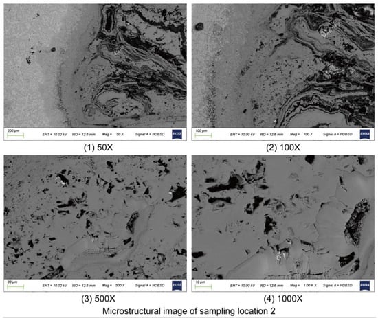 Figure 7, the metallographic microscopic images from sampling location 2 show significant differences in microstructure and corrosion characteristics compared with those from sampling location 1, especially in terms of the crack distribution, corrosion layer morphology, and crystal structure.