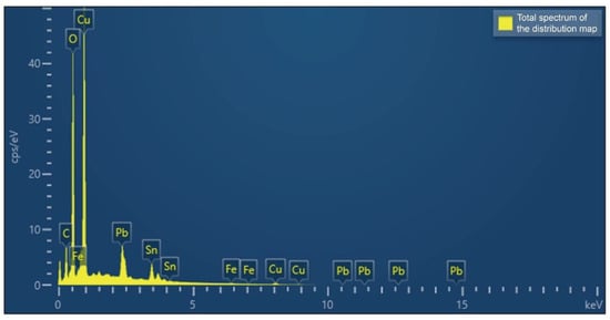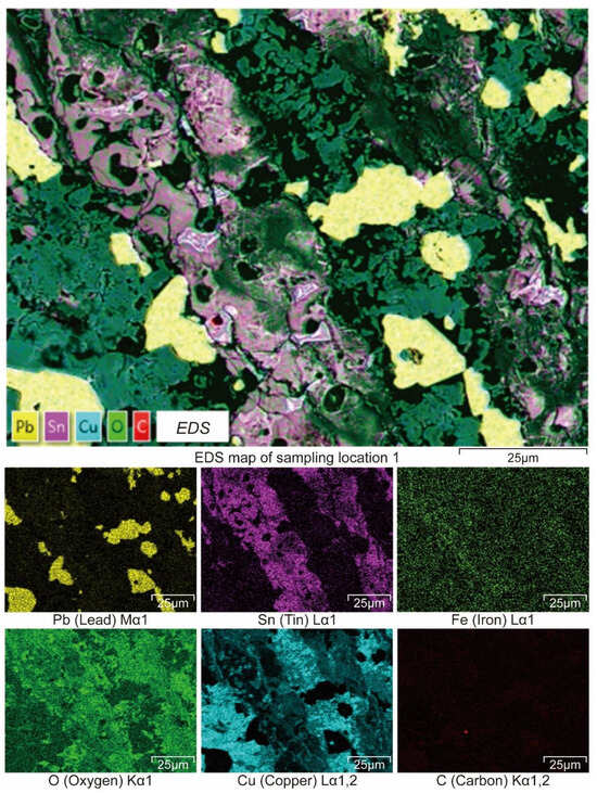 Figure 8 shows the SEM-EDS analysis results of sampling location 1, intuitively presenting the distribution characteristics of the main elements in the corrosion layer in this area and their mutual relationships. In the element superposition distribution diagram, one can see metal elements such as lead (Pb), tin (Sn), and copper (Cu), as well as oxygen (O) and trace amounts of carbon (C). The distribution in the corrosion layer is complex and heterogeneous.
