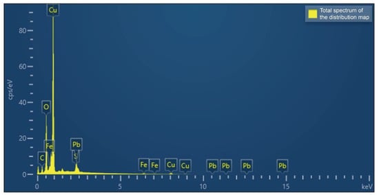Figure 10 shows the SEM-EDS element superposition and distribution results for sampling location 2, depicting the spatial distribution and relative content of the main elements in the corrosion layer in this area. These include lead (Pb), sulfur (S), oxygen (O), iron (Fe), copper (Cu), and carbon (C). In the element distribution map, it can be seen that the corrosion products at sampling location 2 are significantly different from those at sampling location 1, especially due to the appearance of sulfur (S), which provides new research clues about the corrosion environment and mechanism in this area.