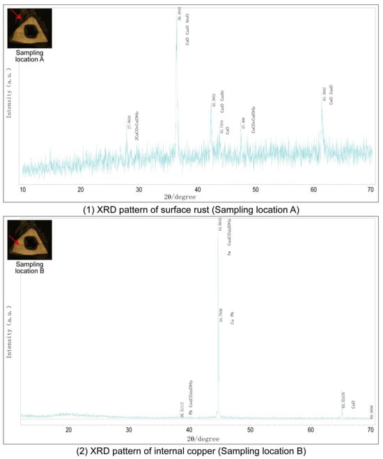 The XRD spectrum of sampling location A shows that the main phases of the surface corrosion layer include copper oxide (CuO, Cu2O), copper carbonate (Cu2(OH)2CO3, i.e., verdigris), and tin oxide (SnO2). Copper oxide and copper carbonate are the most common corrosion products in the surface corrosion process of bronze artifacts. The strong diffraction peaks of CuO and Cu2O show that they dominate the corrosion layer. The appearance of Cu2(OH)2CO3 indicates that the burial environment contains carbonates or carbonate ions in groundwater. These ions react with copper oxide to form stable verdigris-like corrosion products. This layer of corrosion products may provide a protective effect to a certain extent. It is worth noting that the diffraction peak of SnO2 was also detected in the XRD spectrum, indicating that tin (Sn) mainly formed tin oxide products during the corrosion process. Tin oxide is chemically stable and can form a dense protective film in the corrosion layer, thereby slowing down the further development of corrosion.