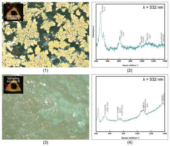 Therefore, the Raman spectrum of sampling location A reflects the complex mineral composition of the surface corrosion layer, which mainly includes Cu2O, SnO2, Cu2(OH)2, and Cu2(OH)2CO3, indicating that oxidation and carbonation reactions in the burial environment play a dominant role in the formation of the corrosion layer. The Raman spectrum of sampling location B shows the relative integrity of the internal matrix, with only small amounts of traces of Cu2O and Cu2(OH)2CO3, as well as the characteristic peaks of Si-O and S-Cu, indicating that the internal environment is less corroded by the outside world, but it is also slightly affected by sulfides and siliceous materials. In summary, the complex mineral composition of the surface corrosion layer of the bronze arrowheads reflects that they have undergone long-term chemical reactions in the underground burial environment, including multiple processes such as oxidation and carbonation. The internal matrix layer is mainly composed of metallic copper (Cu) and tin (Sn), and it only shows limited traces of corrosion.