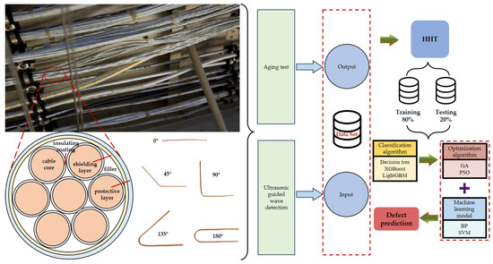 In this study, by constructing a database of aircraft cables with different degrees of damage, combined with the ultrasonic guided wave detection technology, we systematically studied the defect evolution law and its detection method during the aging process of cables. The study firstly simulates the aging process of cables in the actual service environment through accelerated aging experiments, presets defects such as abrasion and cuts, and records new defects such as cracking and peeling of coatings generated during the aging process. On this basis, the defects were accurately measured and classified using metallurgical microscopy and scanning electron microscopy. To address the noise problem in the ultrasonic inspection data, this study innovatively used the Fast Fourier Transform (FFT) and Hilbert–Huang Transform (HHT) for signal preprocessing [38,39]. On this basis, this study compares the performance of three classification algorithms, decision tree, XGBoost, and LightGBM, in defect classification [40,41,42]. The modeling effects before and after data classification are compared to provide a reliable database for subsequent damage prediction. In terms of machine learning model construction, this study adopts two algorithms, BP neural network and SVM, and also introduces GA and PSO to optimize the model parameters and analyzes and compares the effects of different algorithms. This study not only provides a new technical means for the health monitoring of aviation cable but also provides a valuable reference for the nondestructive testing of other complex systems. By revealing the mapping relationship between ultrasonic guided wave signature parameters and insulation coating aging state, this study is expected to provide a theoretical basis and technical support for intelligent operation and maintenance of aircraft cables, which has important theoretical significance and engineering application value.