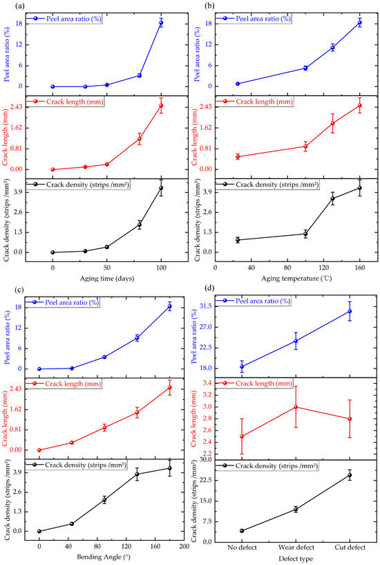 When exploring the effect of aging time on the coating, the aging temperature was set at 160 °C, the bending angle was 180°, and no defects were preset. All the examined specimens were counted, and the effects of different aging times on defect damage are shown in Figure 5a. From Figure 5a, it can be seen that the degree of damage to the insulating coating increases nonlinearly with aging time. In the specimen without preset defects, the aging time has a significant cumulative effect on the insulating coating damage, and its effect shows a nonlinear acceleration characteristic. The experiments showed that the aging time showed a three-stage nonlinear evolution on the damage of insulating coatings. At the initial stage, from 0 to 50 days, the crack density and peeling area increase slowly, mainly due to surface oxidation, and then it enters into the accelerated failure stage after 50 days, with the crack density and peeling area increasing to 1.8 strips/mm2 and 3.2% (at 80 days), and then it reaches the severe failure stage at 100 days, with the crack density surging to 4.2 strips/mm2 (an 11-fold increase compared with that of 50 days), the length of cracks reaching 2.5 mm, and the proportion of peeling area soaring to 2.5 mm, and the percentage of peeled area soared to 18.4%. These results suggest that 50 days is the critical inflection point for damage accumulation, and the exponential increase in the rate of failure at the latter stage may be due to polymer chain breakage and volatilization of the plasticizer, which in turn leads to embrittlement failure.