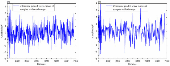 During the aging experiment, the specimens were taken out for ultrasonic-guided wave detection at intervals of 10 days. The raw signals of ultrasonic-guided wave detection are shown in Figure 6a,b. It can be seen from Figure 6a,b that the original ultrasonic signals have more clutter regardless of whether the specimens have defects or not, which leads to the difficulty of extracting the feature signals therein and also makes the subsequent modeling process more difficult. For this reason, both FFT and HHT are used for signal processing in this study. The preprocessing results of the original signals are shown in Figure 6c–f. As can be seen from Figure 6c,e, for the specimen without damage, the effect of noise reduction using HHT is much better than that of FFT. Similarly, for the specimen with damage, the noise reduction effect of HHT is also better than that of FFT, and it can be seen from the noise reduction results of HHT that the ultrasonic guided wave signals can be effectively characterized after noise reduction when there are bends or damages in the specimen, and different types of defects will have different characteristic signal performances. From Figure 6f, it is not difficult to find that the degree of damage is different, the amplitude of the performance will also change accordingly. Therefore, the ultrasonic guided wave signal after HHT noise reduction can be used as a characterization means for detecting cable coatings. Ultrasonic guided wave combined with HHT noise reduction has a high sensitivity for bending and damage, and it can be used for early detection of micro-defects in cable coatings.