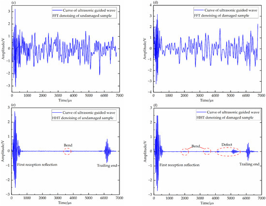 Figure 6. Ultrasonic guided wave detection results and signal processing results are shown in the following diagrams: (a) raw ultrasonic guided wave signal of the undamaged specimen; (b) raw ultrasonic guided wave signal of the specimen with damage; (c) ultrasonic guided wave FFT processed signal of the undamaged specimen; (d) ultrasonic guided wave FFT processed signal of the specimen with damage; (e) ultrasonic guided wave HHT processed signal of the undamaged specimen; (f) ultrasonic guided wave with damaged specimen HHT processed signal.